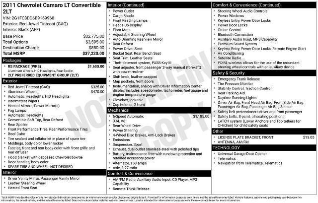 Preferred Equipment Group 2LT (2 Front Cup Holders, 3-Spoke Leather-Wrapped Steering Wheel, 4-Wheel Antilock 4-Wheel Disc Brakes, Analog Instrumentation, Audio System Feature USB Port, Auxiliary Multi-Function Gauges, Bluetooth® For Phone, Boston Acoustics Premium 8-Speaker System, Carpeted Front Floor Mats, Electric Rear-Window Defogger, Electronic Cruise Control, Head-Up Display, Heated Driver & Front Passenger Seats, Inside Rearview Autodimming Mirror, LATCH System, Leather-Appointed Seat Trim, Leather-Wrapped Shift Knob, Maintenance-Free Battery, Manual Rake & Telescopic Steering Column, OnStar 6 Months Directions & Connections Plan, Power Programmable Door Locks, Remote Keyless Entry, StabiliTrak, Stainless-Steel Dual-Outlet Exhaust, Steering Wheel Mounted Audio Controls, Ultrasonic Rear Parking Assist, Universal Home Remote, Wireless PDIM, and XM Radio), RS Package (High-Intensity Discharge Headlamps, Rear Spoiler, RS Unique Tail Lamps, and AM/FM Antenna), 19 Painted Aluminum Wheels, 20 x 8 Front & 20 x 9 Rear Aluminum Wheels, 20 x 8 Front & 20 x 9 Rear Polished Alum Wheels, 4-Wheel Disc Brakes, 9 Speakers, ABS brakes, Air Conditioning, Alloy wheels, AM/FM radio: XM, AM/FM/CD-ROM/MP3, Auto-dimming door mirrors, Auto-dimming Rear-View mirror, Brake assist, Bumpers: body-color, CD player, Compass, Convertible roof lining, Delay-off headlights, Driver door bin, Driver vanity mirror, Dual front impact airbags, Dual front side impact airbags, Electronic Stability Control, Emergency communication system: OnStar Directions & Connections, Four whe