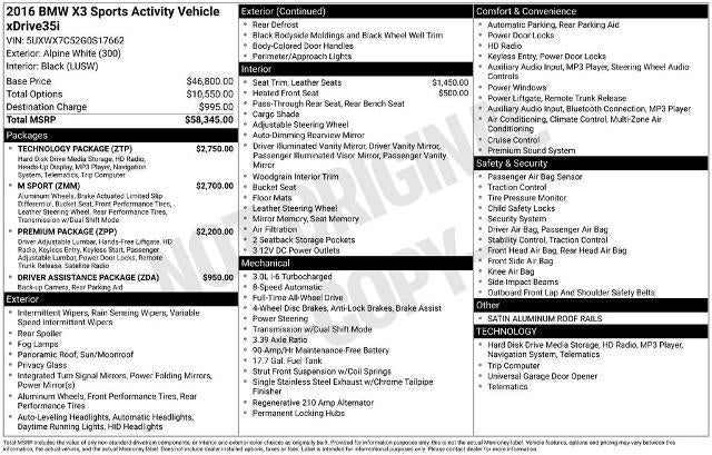 Cold Weather Package (Heated Front Seats, Heated Rear Seats, Heated Steering Wheel, and Retractable Headlight Washers), Driver Assistance Package (Rear-View Camera), M Sport Package, Premium Package (Comfort Access Keyless Entry, Lumbar Support, Nevada Leather Upholstery, and Satellite Radio), Technology Package (Head-Up Display, Instrument Cluster w/Extended Contents, Navigation System, Advanced Real-Time Traffic Information, BMW Online & BMW Apps, and Remote Services), 16 Speakers, 3.39 Axle Ratio, 4-Wheel Disc Brakes, ABS brakes, Aerodynamic Kit, Air Conditioning, Alloy wheels, AM/FM radio, Anthracite Headliner, Anti-Theft AM/FM Stereo CD/MP3 Player, Anti-whiplash front head restraints, Auto-dimming door mirrors, Auto-dimming Rear-View mirror, Automatic temperature control, Bodyside moldings, Brake assist, Bumpers: body-color, CD player, Delay-off headlights, Driver door bin, Driver vanity mirror, Dual front impact airbags, Dual front side impact airbags, Electronic Stability Control, Emergency communication system: BMW Assist eCall, Fineline Anthracite Wood Trim, Four wheel independent suspension, Front anti-roll bar, Front Bucket Seats, Front Center Armrest, Front dual zone A/C, Front fog lights, Front reading lights, Fully automatic headlights, Garage door transmitter, Genuine wood console insert, Hands-Free Bluetooth® & USB Audio Connection, harman/kardon Surround Sound System, harman/kardon® Speakers, HD Radio, High intensity discharge headlights: Bi-xenon, Illuminated entry, Increased Top Speed Limiter, Leather steering wheel, Low tire pressure warning, M Steering Wheel, Memory seat, Occupant sensing airbag, Outside temperature display, Overhead airbag, Panic alarm, Park Distance Control, Passenger door bin, Passenger vanity mirror, Performance Control, Power door mirrors, Power driver seat, Power Front Bucket Seats, Power Liftgate, Power moonroof, Power passenger seat, Power steering, Power windows, Radio BMW Professional, Radio data system, Rain sensing wipers, Rear anti-roll bar, Rear fog lights, Rear reading lights, Rear seat center armrest, Rear window defroster, Rear window wiper,