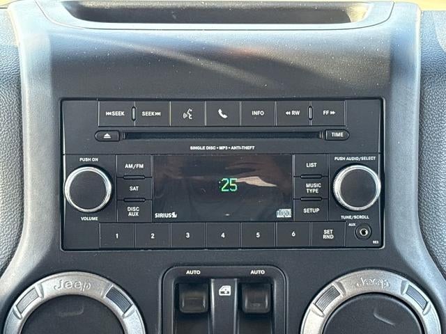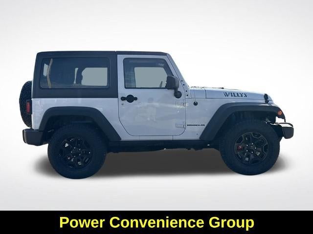 Connectivity Group (Remote USB Port, Tire Pressure Monitoring Display, Uconnect Voice Command w/Bluetooth®, and Vehicle Information Center), Power Convenience Group (Auto-Dimming Mirror w/Reading Lamp, Front 1-Touch Down Power Windows, Power Heated Mirrors, Power Locks, Remote Keyless Entry, and Security Alarm), Quick Order Package 24W Willys Wheeler (3.73 Rear Axle Ratio, 4-Wheel Drive Swing Gate Decal, Air Conditioning, Anti-Spin Differential Rear Axle, Black Jeep Grille Badge, Deep Tint Sunscreen Windows, Jeep Trail Rated Kit, Low Gloss Black Wrangler Decal, MOPAR Slush Mats, Performance Suspension, Rear Passenger Assist Handles Kit, SIRIUS Satellite Radio, Wheels: 17 x 7.5 High Gloss Black Willys, Willys Hood Decal, Willys Wheeler Grille, and 1-Yr SiriusXM Radio Service), Willys Wheeler Package, 16 x 7.0 Luxury Styled Steel Wheels, 4-Wheel Disc Brakes, 8 Speakers, ABS brakes, AM/FM radio, Audio Jack Input for Mobile Devices, Black 3-Piece Hard Top, Brake assist, CD player, Cloth Seats w/Adjustable Head Restraints, Compass, Delete Sunrider Soft Top, Driver door bin, Driver vanity mirror, Dual front impact airbags, Electronic Stability Control, Freedom Panel Storage Bag, Front anti-roll bar, Front Bucket Seats, Front Center Armrest w/Storage, Front fog lights, Integrated roll-over protection, Low tire pressure warning, Normal Duty Suspension, Occupant sensing airbag, Outside temperature display, Passenger door bin, Passenger vanity mirror, Power steering, Radio: 130, Rear anti-roll bar, Rear Window Defroster, Rear Window Wiper/Washer, Speed control, Steering wheel mounted audio controls, Sunrider Soft Top, Tachometer, Tilt steering wheel, Tinted Rear Quarter & Liftgate Windows, Traction control, Trip computer, and Variably intermittent wipers.