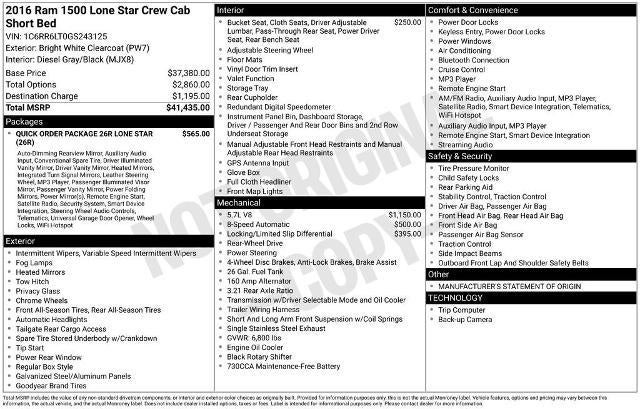 2016 Ram 1500 Lone Star Bright White Clearcoat RWD 8-Speed Automatic HEMI 5.7L V8 Multi Displacement VVT
