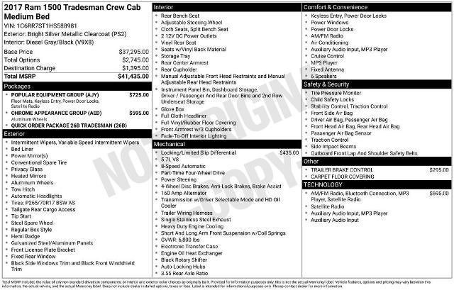 Chrome Appearance Group (17 x 7 Aluminum Wheels, Bright Front Bumper, Bright Grille, and Bright Rear Bumper), Popular Equipment Group (1-Yr SiriusXM Radio Service, 40/20/40 Split Bench Seat, Carpet Floor Covering, Cloth 40/20/40 Bench Seat, For More Info, Call 800-643-2112, Front & Rear Floor Mats, Front Armrest w/3 Cupholders, No Satellite Coverage w/AK/HI/PR/VI, Rear Folding Seat, Remote Keyless Entry w/All-Secure, SIRIUSXM Satellite Radio, and Storage Tray), Quick Order Package 26B Tradesman, Tradesman Package, 17 x 7 Steel Wheels, 4-Wheel Disc Brakes, 5.0 Touchscreen Display, 6 Speakers, ABS brakes, Active Grille Shutters, Air Conditioning, AM/FM radio, Anti-Spin Differential Rear Axle, Audio Jack Input for Mobile Devices, Black Exterior Mirrors, Black Rotary Shifter, Brake assist, Charge Only Remote USB Port, Delay-off headlights, Driver door bin, Dual front impact airbags, Dual front side impact airbags, Electronic Shift, Electronic Stability Control, Electronically Controlled Throttle, Engine Oil Heat Exchanger, Exterior Mirrors w/Heating Element, Front anti-roll bar, Front Center Armrest, Front wheel independent suspension, Fully automatic headlights, GPS Antenna Input, Heated door mirrors, Heavy Duty Vinyl 40/20/40 Split Bench Seat, Heavy-Duty Engine Cooling, Hemi Badge, Integrated Voice Command w/Bluetooth®, Low tire pressure warning, Media Hub (USB, AUX), Occupant sensing airbag, Overhead airbag, Overhead Console, Passenger door bin, Power door mirrors, Power steering, Power windows, Radio data system, Radio: Uconnect 3 w/5 Display, Radio: Uconnect 3.0, Rear anti-roll bar, Rear seat center armrest, Rear step bumper, Remote USB Port, Speed control, Tachometer, Temperature & Compass Gauge, Tilt steering wheel, Tip Start, Traction control, Trailer Brake Control, Variably intermittent wipers, and Voltmeter.