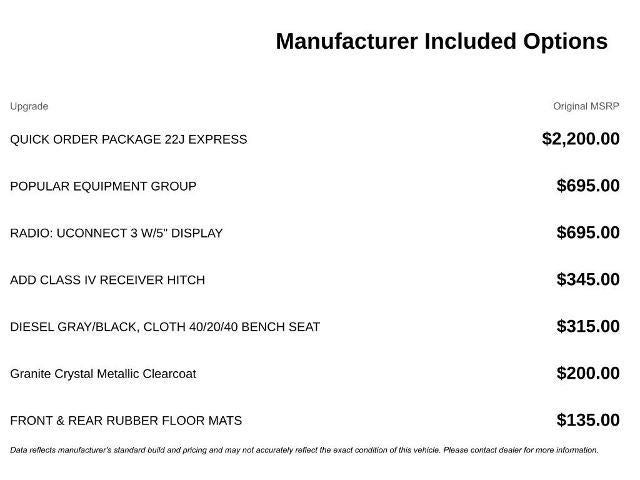 Popular Equipment Group (1-Year SiriusXM Radio Service, 40/20/40 Split Bench Seat, Cloth 40/20/40 Bench Seat, For More Info, Call 800-643-2112, Front Armrest w/3 Cupholders, Manual Adjust Seats, No Satellite Coverage w/AK/HI/PR/VI/GU, Rear Folding Seat, Remote Keyless Entry w/All-Secure, and SiriusXM Satellite Radio), Quick Order Package 22J Express (17 x 7 Aluminum Wheels, Body Color Front Fascia, Body Color Grille, Body Color Rear Bumper w/Step Pads, Carpet Floor Covering, Center Hub, Delete Class IV Receiver Hitch, Delete Spray In Bedliner, Front Floor Mats, Front Fog Lamps, Ram 1500 Express, and Rear Floor Mats), 17 x 7 Steel Wheels, 3.21 Rear Axle Ratio, 4-Wheel Disc Brakes, 5.0 Touchscreen Display, 6 Speakers, ABS brakes, Add Class IV Receiver Hitch, Air Conditioning, AM/FM radio, Audio Jack Input for Mobile Devices, Auto-dimming Rear-View mirror, Black Exterior Mirrors, Brake assist, Charge Only Remote USB Port, Delay-off headlights, Driver door bin, Dual front impact airbags, Dual front side impact airbags, Electronic Stability Control, Exterior Mirrors w/Heating Element, Front & Rear Rubber Floor Mats, Front anti-roll bar, Front Center Armrest, Front wheel independent suspension, Fully automatic headlights, GPS Antenna Input, Heated door mirrors, Heavy Duty Vinyl 40/20/40 Split Bench Seat, Integrated Voice Command w/Bluetooth®, Low tire pressure warning, Media Hub (USB, AUX), Occupant sensing airbag, Overhead airbag, Overhead Console, ParkView Rear Back-Up Camera, Passenger door bin, Power door mirrors, Power steering, Power windows, Radio data system, Radio: 3.0, Radio: Uconnect 3 w/5 Display, Rear anti-roll bar, Rear step bumper, Rear View Day/Night Mirror, Remote USB Port, Speed control, Tachometer, Temperature & Compass Gauge, Tilt steering wheel, Traction control, Variably intermittent wipers, and Voltmeter.