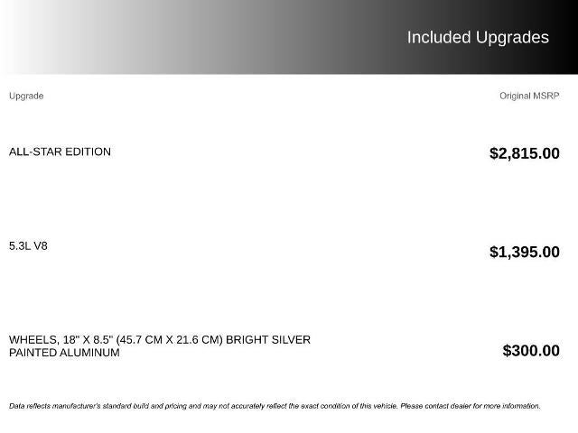 - 5.3L V8 (EcoTec3) engine, All-Star Edition, Convenience Package, Preferred Equipment Group 1LT, Trailering Package