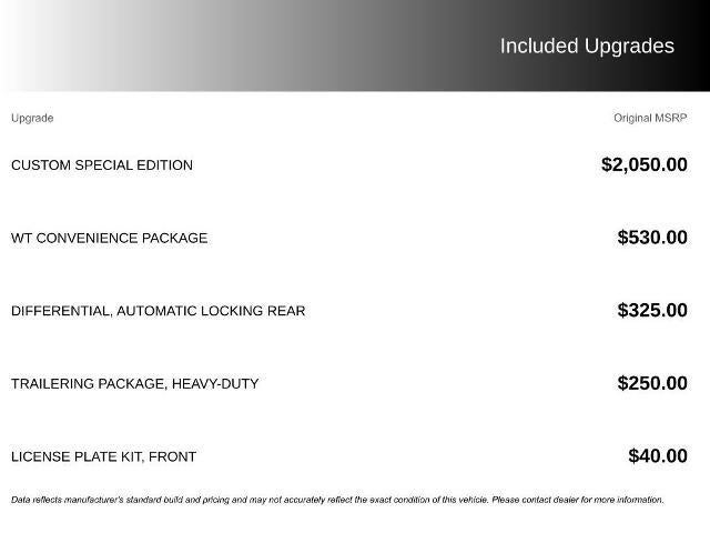 Custom Special Edition (Body-Color Door Handles, Body-Color Grille, Outside Power-Adjustable Body-Color Mirrors, Rear Body-Color Bumper, and Wheels: 18 x 8.5 Dark Argent Metallic Cast Alloy), Heavy-Duty Trailering Package, OnStar & Chevrolet Connected Services Capable (4G LTE Wi-Fi Hotspot Capable and Chevrolet Connected Access Capable), Preferred Equipment Group 4WT, WT Convenience Package (Electronic Automatic Cruise Control, Extended Range Remote Keyless Entry, EZ-Lift & Lower Tailgate, Remote Locking Tailgate, and Unauthorized Entry Theft-Deterrent System), 3.42 Rear Axle Ratio, 4-Wheel Disc Brakes, 6 Speakers, 6-Speaker Audio System Feature, ABS brakes, Air Conditioning, AM/FM radio, Apple CarPlay/Android Auto, Automatic Locking Rear Differential, Bumpers: body-color, Cloth Seat Trim, Delay-off headlights, Driver 4-Way Power Seat Adjuster, Driver door bin, Dual front impact airbags, Dual front side impact airbags, Electronic Stability Control, Exterior Parking Camera Rear, Front anti-roll bar, Front Bucket Seats, Front Center Armrest, Front License Plate Kit, Front wheel independent suspension, Fully automatic headlights, Low tire pressure warning, Occupant sensing airbag, Overhead airbag, Passenger door bin, Passenger vanity mirror, Power driver seat, Power steering, Power windows, Premium audio system: Chevrolet Infotainment 3, Radio data system, Radio: Chevrolet Infotainment 3 System, Rear seat center armrest, Rear step bumper, Speed-sensing steering, Tachometer, Tilt steering wheel, Tow/Haul Mode, Traction control, Trip computer, Variably intermittent wipers, and Wheels: 16 x 7 Ultra Silver Metallic Steel.