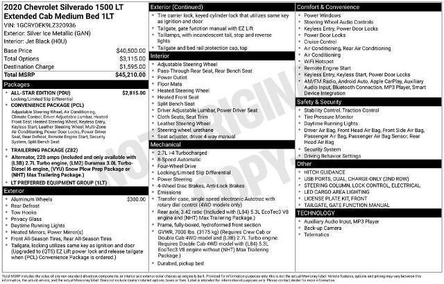 All-Star Edition (Heavy-Duty Rear Locking Differential), Convenience Package (10-Way Power Driver Seat w/Lumbar, 12-Volt Rear Auxiliary Power Outlet, 40/20/40 Front Split-Bench Seat, Dual-Zone Automatic Climate Control, Electric Rear-Window Defogger, Electrical Lock Control Steering Column, EZ Lift Power Lock & Release Tailgate, Heated Driver & Front Outboard Passenger Seats, Heated Steering Wheel, Keyless Open & Start, Leather Wrapped Steering Wheel, LED Cargo Area Lighting, Manual Tilt/Telescoping Steering Column, Rear Dual USB Charging-Only Ports, Remote Vehicle Starter System, and Theft Deterrent System (Unauthorized Entry)), Preferred Equipment Group 1LT (2 USB Ports (First Row), 4-Way Manual Driver Seat Adjuster, 4.2 Diagonal Color Display Driver Info Center, Bluetooth® For Phone, Chrome Grille, Chrome Mirror Caps, Color-Keyed Carpeting Floor Covering, Compass, Deep-Tinted Glass, Front Frame-Mounted Black Recovery Hooks, Front Rubberized Vinyl Floor Mats, Locking Tailgate, Manual Tilt-Wheel Steering Column, OnStar & Chevrolet Connected Services Capable, Power Door Locks, Power Front Windows w/Driver Express Up/Down, Power Front Windows w/Passenger Express Down, Power Rear Windows w/Express Down, Rear 60/40 Folding Bench Seat (Folds Up), Rear Rubberized-Vinyl Floor Mats, Rear Vision Camera, Remote Keyless Entry, Single-Zone Manual/Semi-Automatic Air Conditioning, Steering Wheel Audio Controls, Steering Wheel Mounted Electronic Cruise Control, Urethane Steering Wheel, 4G LTE Wi-Fi Hot Spot Capable, and Chevrolet Connected Access Capable), Trailering Package (Hitch Guidance),