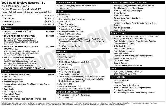 Preferred Equipment Group 1SL (Front & Rear Park Assist and Heated Steering Wheel), Sound & Sites Package (Radio: Buick Infotainment Sys AM/FM Stereo w/Nav, 120-Volt Power Outlet, Bose Performance-Enhanced 10-Speaker System, and SiriusXM w/360L), Sport Touring Edition (Sport Touring Liftgate Badging, Unique Sport Grille w/Body-Color Surround, and Wheels: 20 Gloss Black), Technology Package (Adaptive Cruise Control, Inside Rearview Mirror w/Full Camera Display, Enhanced Automatic Emergency Braking, HD Surround Vision, Rear Camera Mirror Washer, and Rear Pedestrian Alert), 18 Aluminum Wheels, 3.49 Axle Ratio, 3rd row seats: split-bench, 4-Wheel Disc Brakes, 6 Speakers, 6-Speaker Audio System Feature, 6-Way Power Front Passenger Seat Adjuster, 7-Passenger Seating, 8-Way Power Driver Seat Adjuster, ABS brakes, Air Conditioning, Alloy wheels, AM/FM radio: SiriusXM with 360L, Auto High-beam Headlights, Auto-dimming door mirrors, Auto-dimming Rear-View mirror, Automatic temperature control, Brake assist, Bumpers: body-color, Compass, Delay-off headlights, Driver door bin, Driver vanity mirror, Dual front impact airbags, Dual front side impact airbags, Electronic Stability Control, Emergency communication system: OnStar and Buick connected services capable, Four wheel independent suspension, Front anti-roll bar, Front Bucket Seats, Front Center Armrest, Front dual zone A/C, Front reading lights, Fully automatic headlights, Garage door transmitter, Heated door mirrors, Heated Driver & Front Passenger Seats, Heated front seats, Heated steering wheel, Illuminated entry, Leather steering wheel, Low tire pressure warning, Occupant sensing airbag, Outside temperature display, Overhead airbag, Overhead console, Panic alarm, Passenger door bin, Passenger vanity mirror, Perforated Leather-Appointed Seat Trim, Power door mirrors, Power Driver Lumbar Control Seat Adjuster, Power driver seat, Power Liftgate, Power Passenger Lumbar Control Seat Adjuster, Power passenger seat, Power steering, Power windows, Premium audio system: Buick Infotainment System, Radio data system, Radio: Buick Infotainment System AM/F